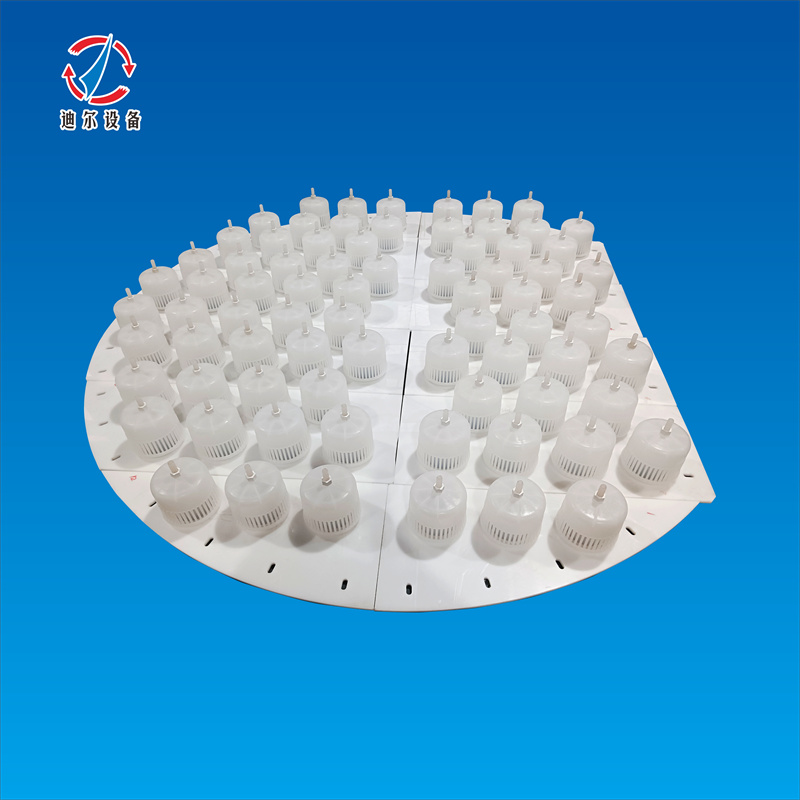 江西省萍乡市迪尔化工填料有限公司为满足客户需求,加工的塑料泡罩塔盘是工业上应用很早的一种塔盘。是在塔盘板上 开许多圆孔,每个圆孔上焊接一个短管,称为升气管,管上 再罩一个“帽子”,称为泡罩,泡罩周围开有许多条形孔。工 作时,液体由上层塔盘经降液管流入下层塔盘,然后横向渡 过塔盘板,流入再下一层塔盘;气体从下层塔盘上升进入升 气管,通过环形通道再经泡罩的条形孔流散到泡罩间的液 层中。