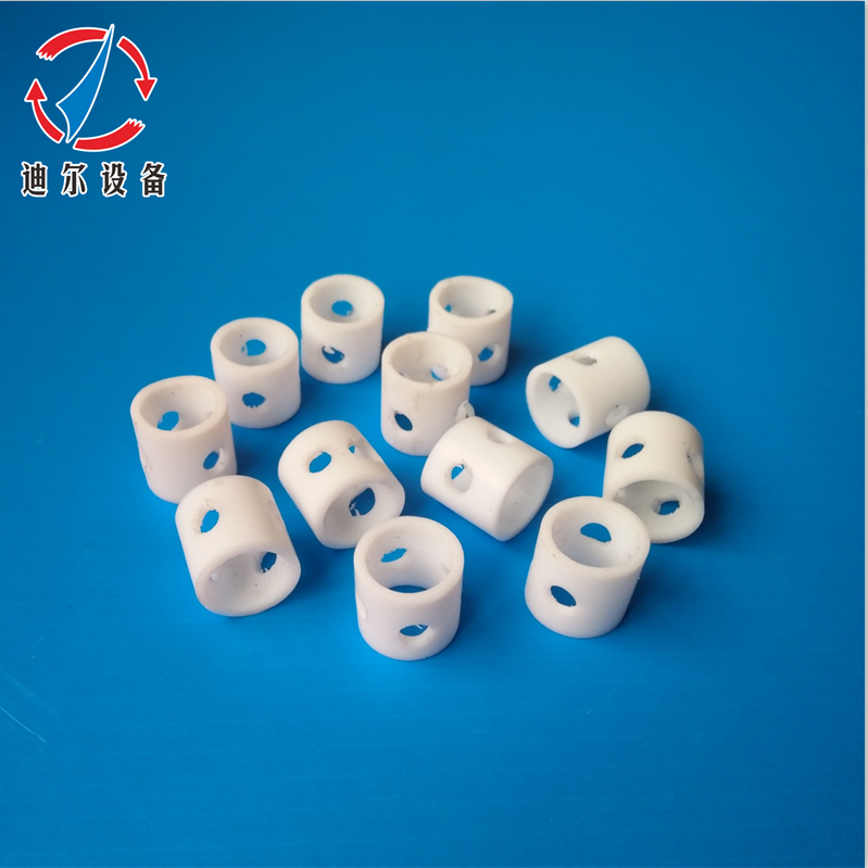 江西省萍乡市迪尔化工填料有限公司生产的四氟开孔式拉西环填料特点:具有低压降,通量大,效率高,液体分布好等特点,我公司新开发的加强鲍尔环可耐250℃高温下不压扁,并能保证气液介质的通畅。